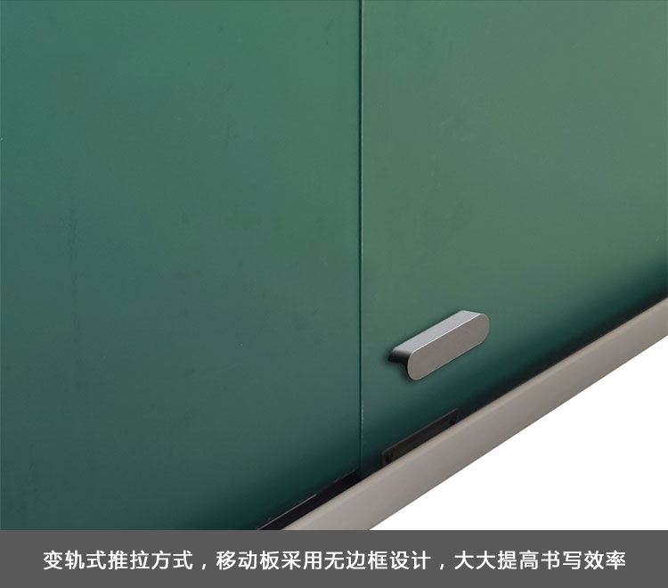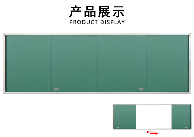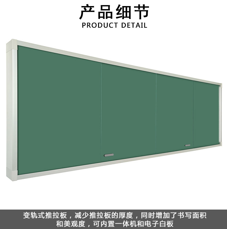 四平推拉黑板,又称变轨式推拉黑板,当不使用触摸电视机或电子白板时,黑板的活动板与固定板处于同一水平上,