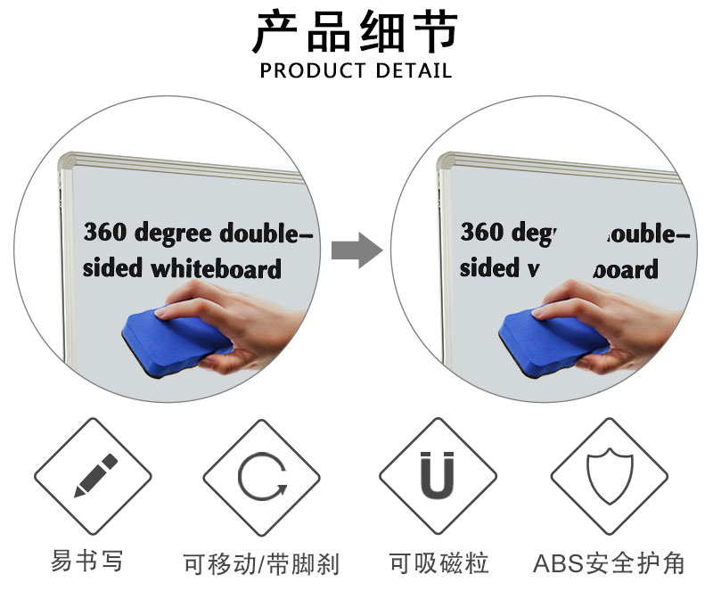 9、易用性:架子两端各配有两个手拧,一个用于固定,一个用于翻转。当一面写完后,拧出两端手拧,即可翻转白板。