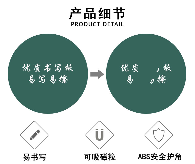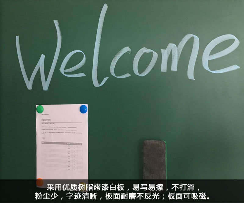 达到(国家标准)GB/T1743-79(89)标准,板面可吸附磁针、磁片,书写面平整,颜色均匀,坚固耐用、哑光,有效保护师生的视力健康。